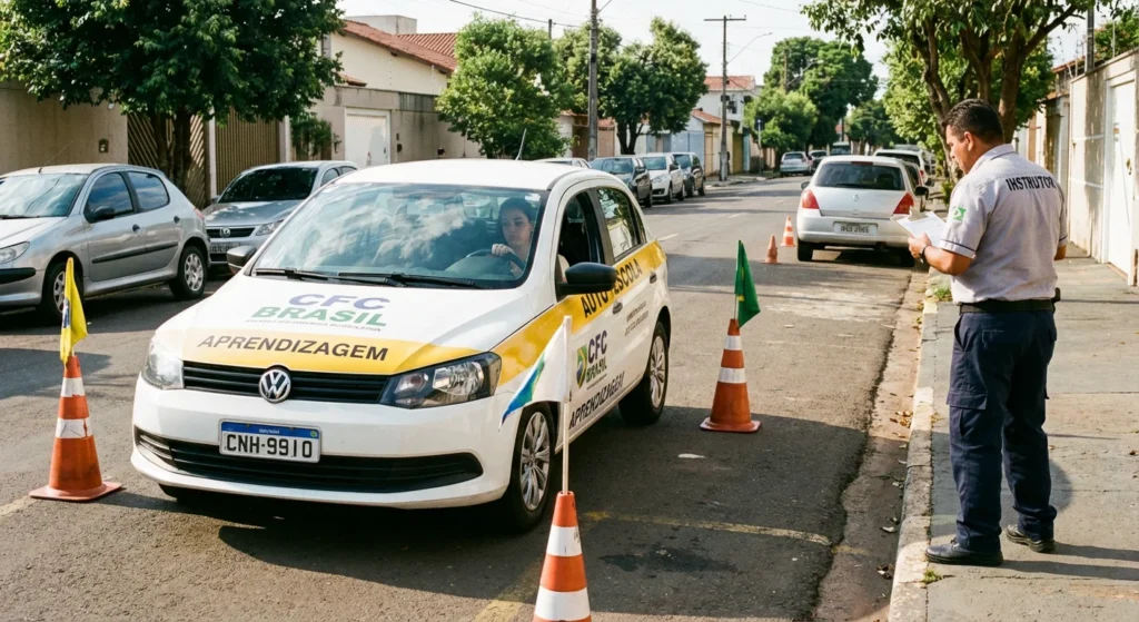 Carro autoescola posicionado em vaga de baliza para treino do exame da CNH, sob olhar de instrutor.